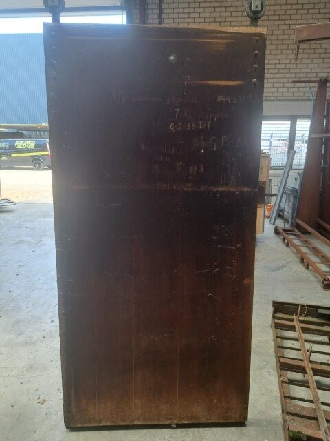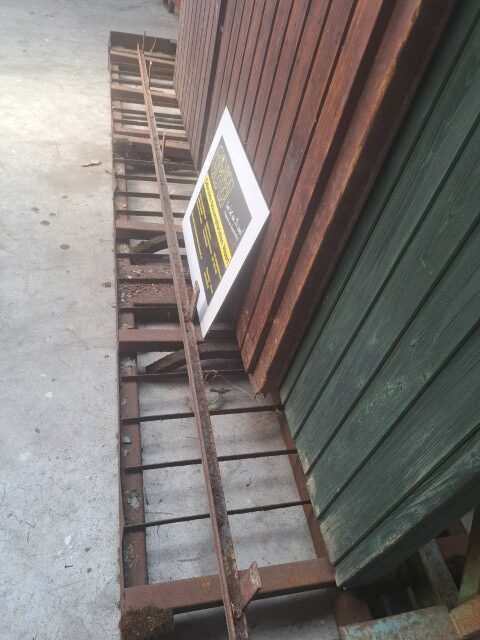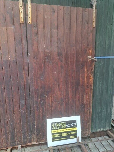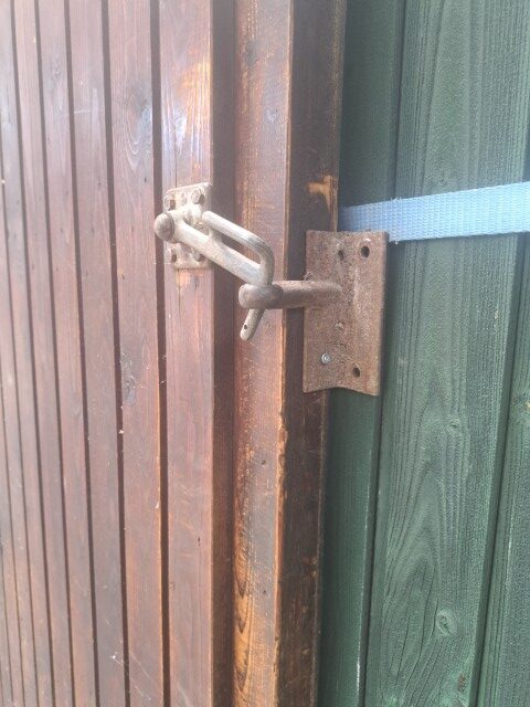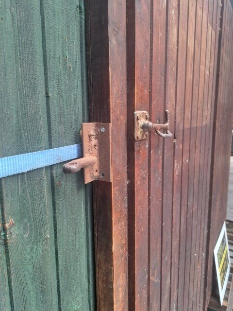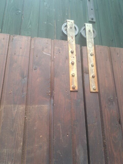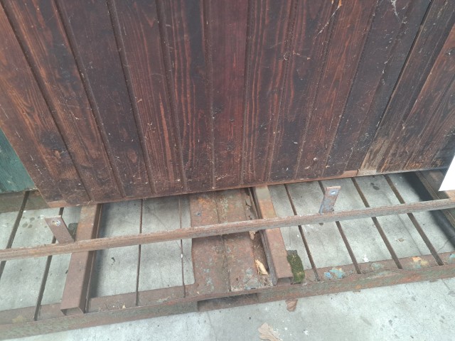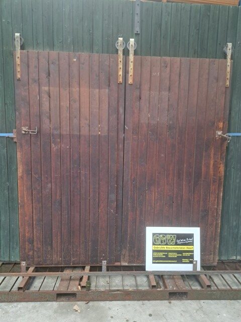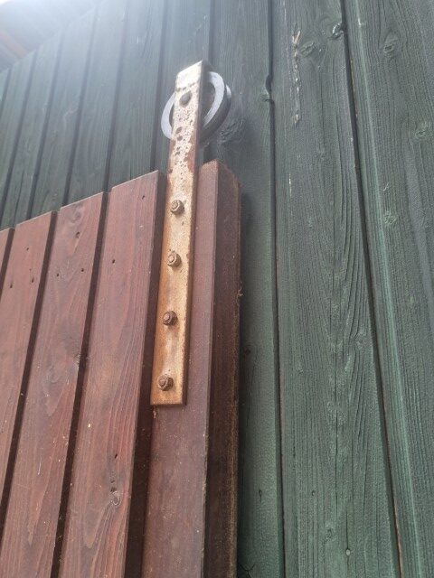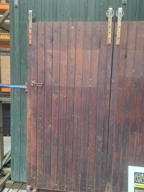Dubbele (vuren)houten schuifpoort met rolwielen en geleidelingsrail.