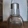 Plafondlamp met melkglas en zilverkleurige rand.